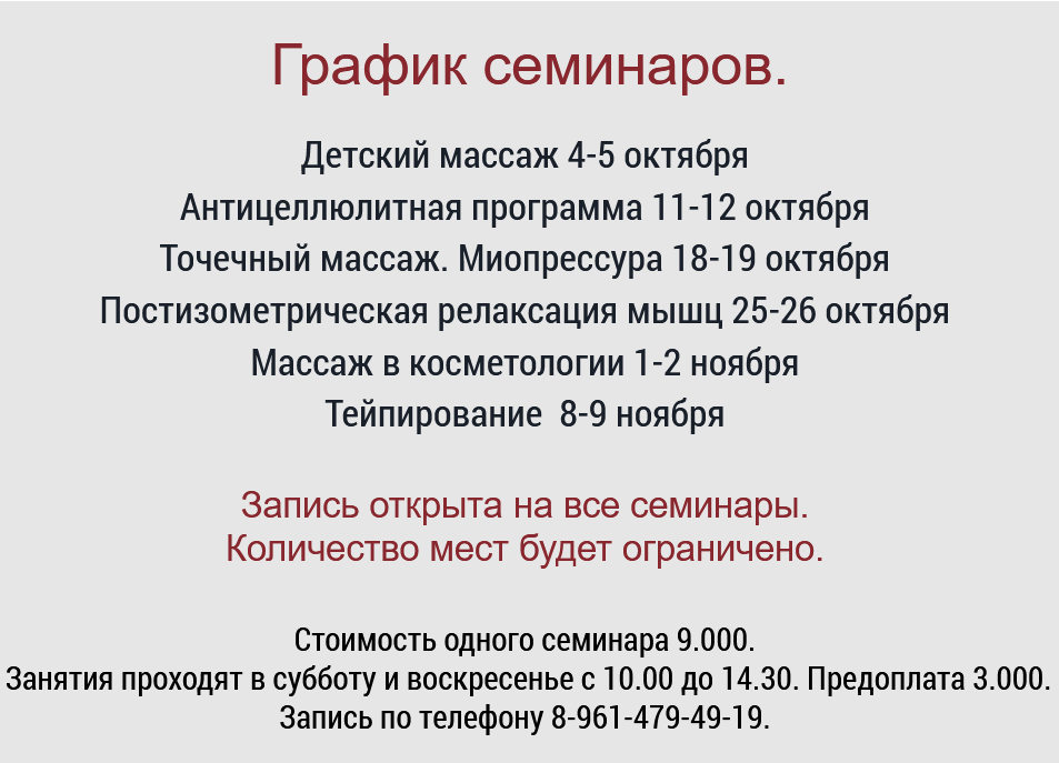 Запись открыта на все семинары. Телефон для записи 8-961-479-49-19